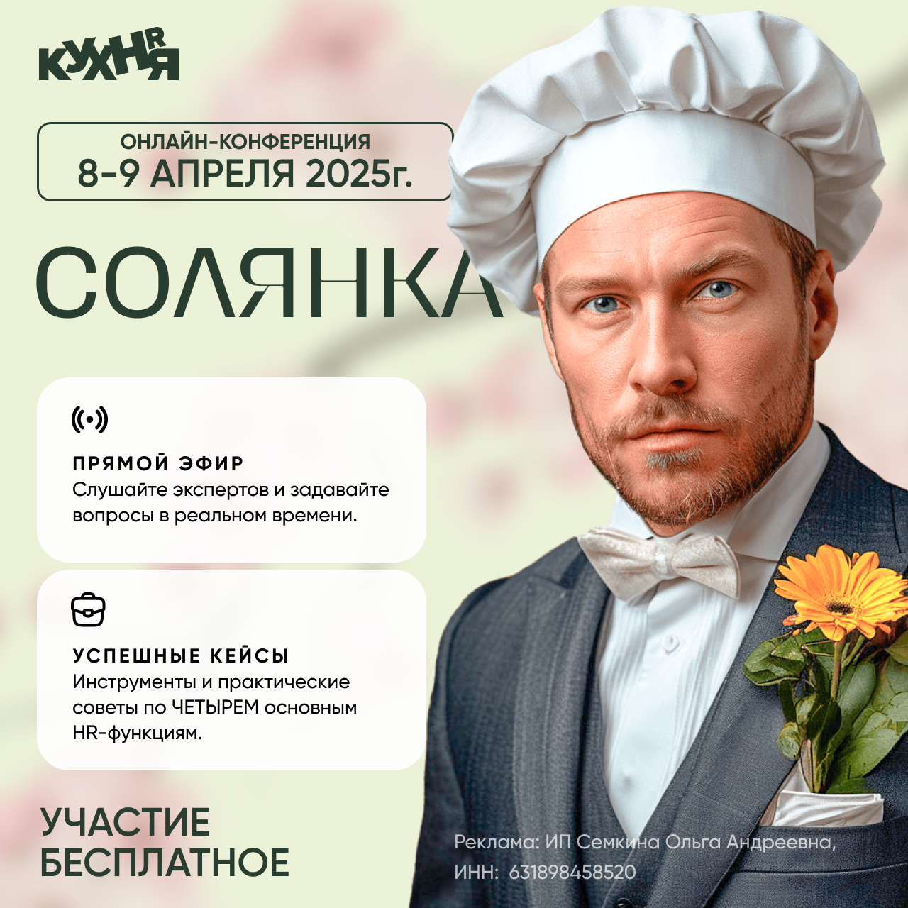 | "СОЛЯНКА" - ежегодная онлайн конференция образовательного проекта HR-КУХНЯ | Когда: 8-9 апреля 2025 года Формат: Онлайн-конференция На конференции мы поможем участникам раскрыть, показать и совместно найти решения и инструменты, с помощью которых все функции управления персоналом могут быть максимально полезными бизнесу при минимальных затратах. Мы приглашаем вас присоединиться к онлайн-конференции, в фокусе которой актуальные и передовые технологии для работы с персоналом по восьми HR-направлениям. Мы предлагаем вам не просто участие в конференции, а рабочие инструменты, цифровые технологии и подходы, которые призваны сделать работу службы персонала более эффективной и более Digital :) Не упустите возможность узнать обо всех цифровых тенденциях и инновациях! Участие бесплатное! Для участия в конференции и для получения материалов участника требуется регистрация: https://hrkitchen.ru/solyanka-spring-2025Вместе с материалами конференции, вы получаете возможность заочно присутствовать на конференции, прослушать все доклады, посмотреть презентации с бессрочным доступом! Партнеры конференции:- Институт Тренинга (входит в состав ГК «Институт Тренинга – АРБ Про») 32 года занимается развитием сотрудников компаний и повышением квалификации корпоративных тренеров. Наши основные компетенции: управление изменениями, личная эффективность и стрессоустойчивость, системное и креативное мышление, деловая коммуникация и переговоры, развитие управленческих компетенций, повышение квалификации тренеров, оценка и развитие персонала.